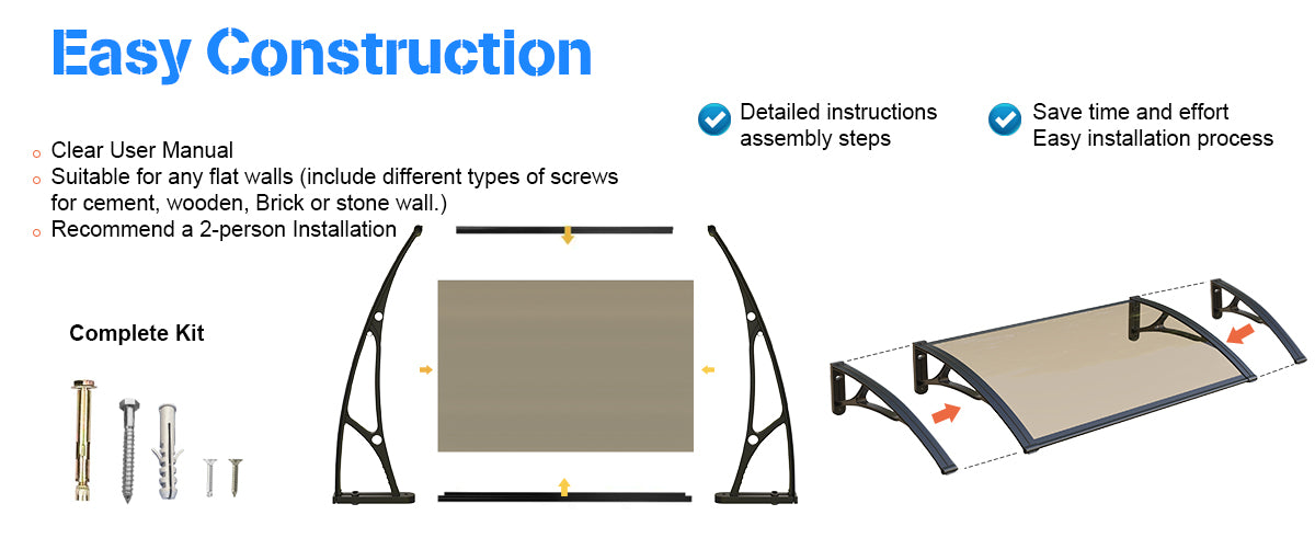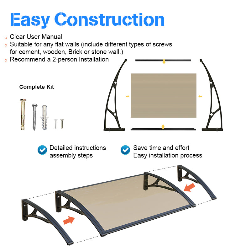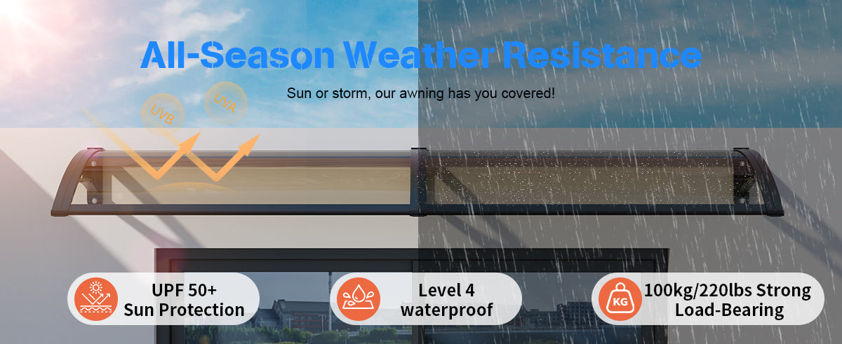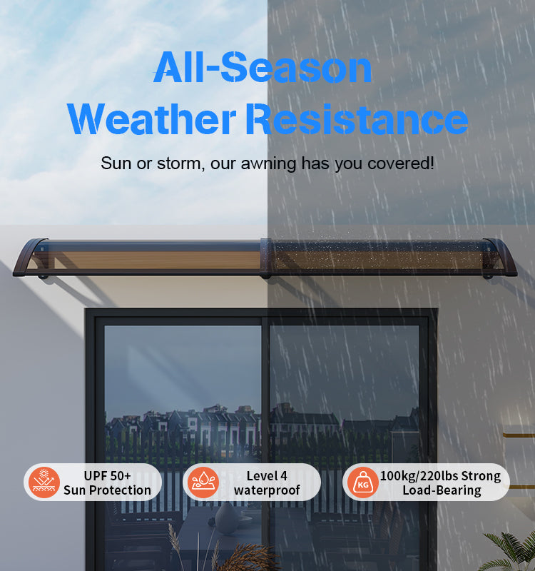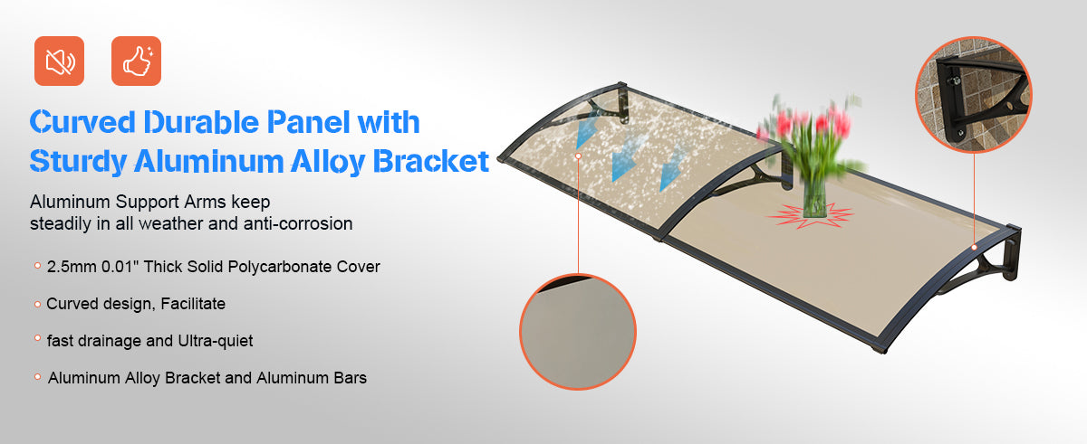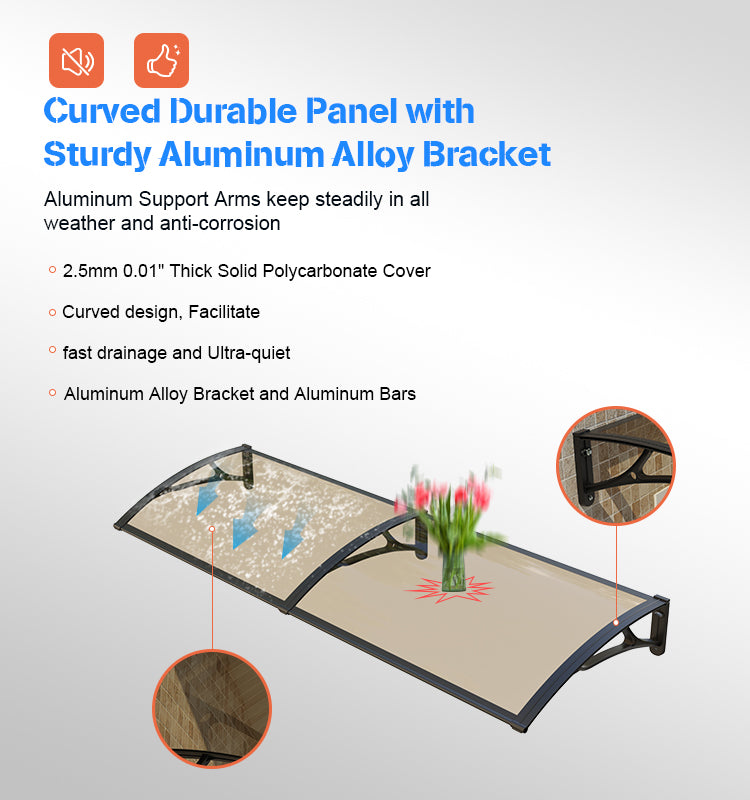 Im Gegensatz zu anderen Markisen sind unsere Bogenmarkisen mit soliden Polycarbonatplatten ausgestattet, die stoßfest und bei Regen geräuschlos sind. Sie trocknen schnell und sind dank der Halterung aus Aluminiumlegierung frei von Rost- und Korrosionsproblemen.