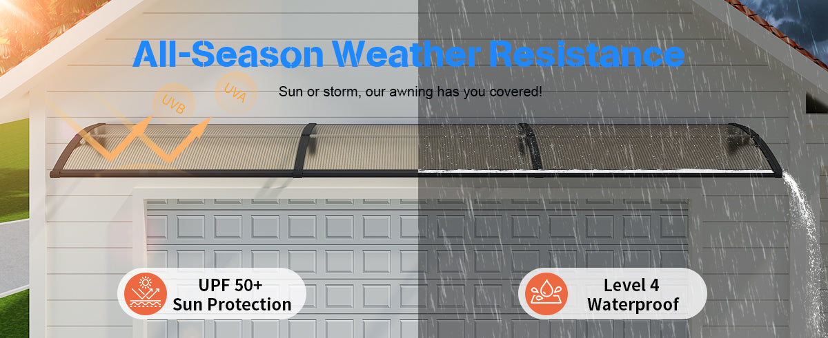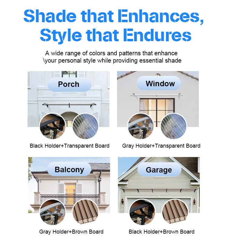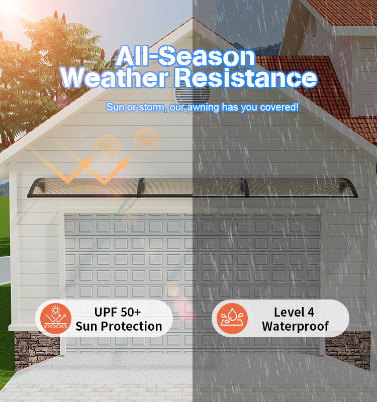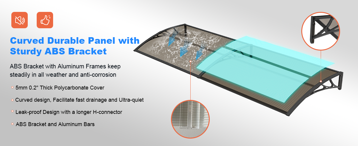 This awning is made with durable ABS brackets and a polycarbonate hollow sheet. The ABS ensures strength and impact resistance, while the PC sheet offers UV protection and high light transmittance.