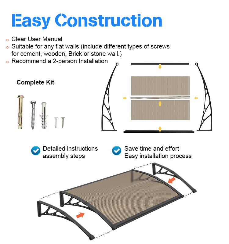 Notre auvent de fenêtre comprend des images d'instructions détaillées et claires, simplifiant le processus d'installation pour vous faire gagner du temps et des efforts. Pour plus de facilité, nous recommandons une installation à deux personnes, et l'assemblage de plusieurs auvents est simple et sans tracas. De plus, cet auvent de porte est compatible avec différents types de murs, qu'ils soient en ciment, en bois, en brique ou autres. Remarque : veuillez vous assurer que la taille est correcte avant de procéder à votre achat.