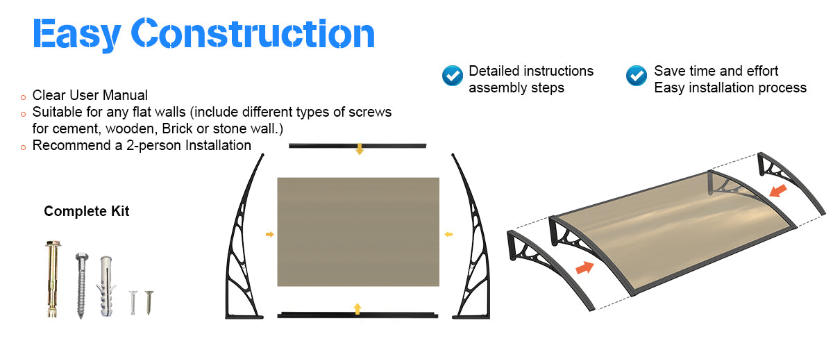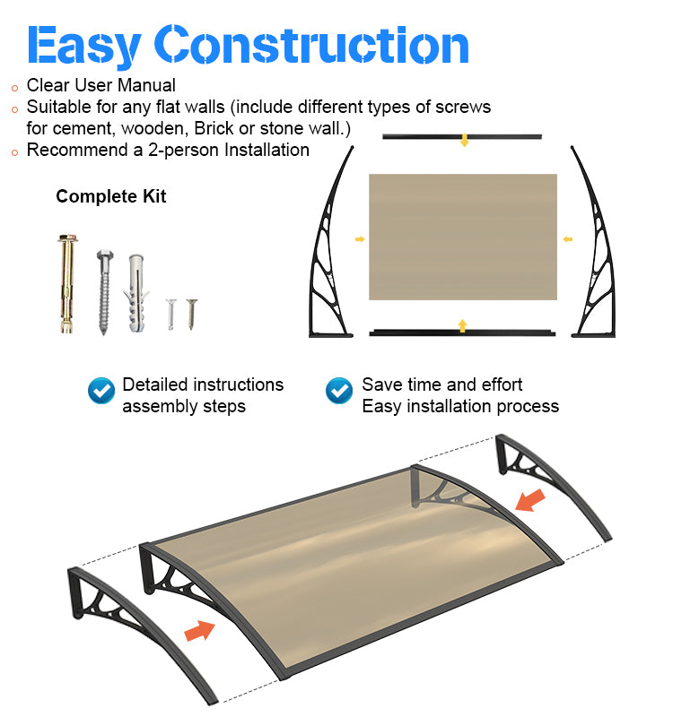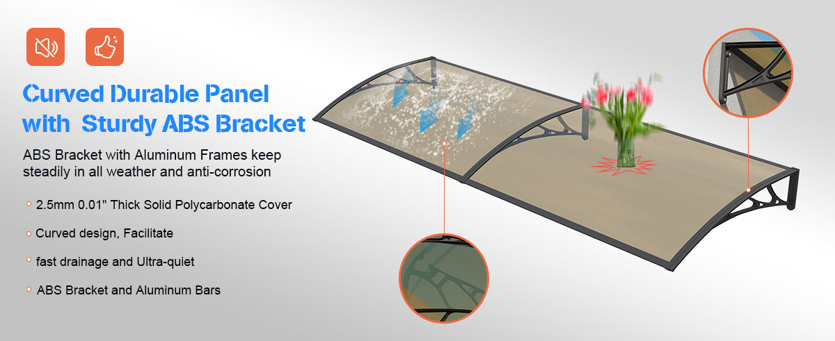 A differenza di altre tende da sole, le nostre tende da sole ad arco sono dotate di pannelli in policarbonato solido, resistenti agli urti e silenziosi sotto la pioggia. Si asciugano rapidamente e, con la staffa in ABS, sono esenti da problemi di ruggine o corrosione.